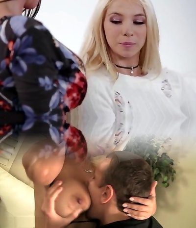 Hot blondes enjoy lesbian fucky-fucky before cumshot threesome