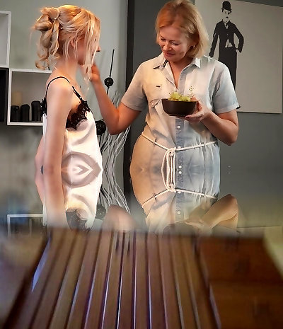 Puny teen gets a lesson in lesbian sex by a mature blonde