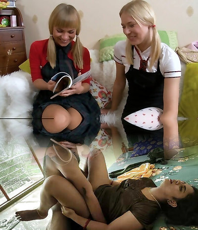 Mamma fucks a bony young daughter in white panties and with a hairy pussy.