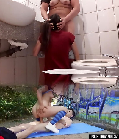 Ultra-kinky chick licking lesbian friends pussy in public toilet